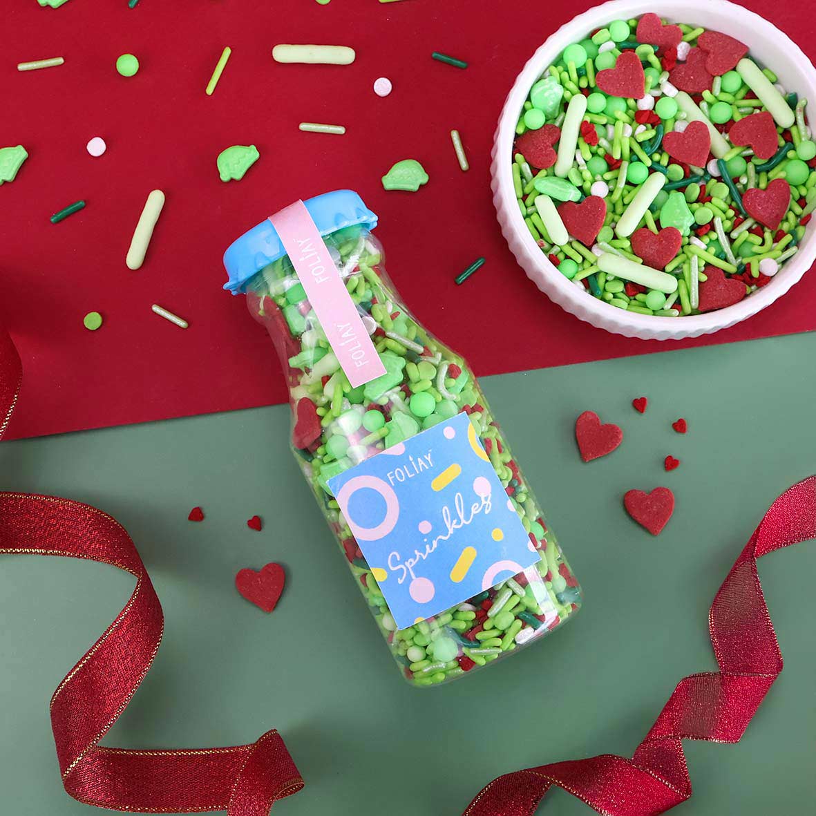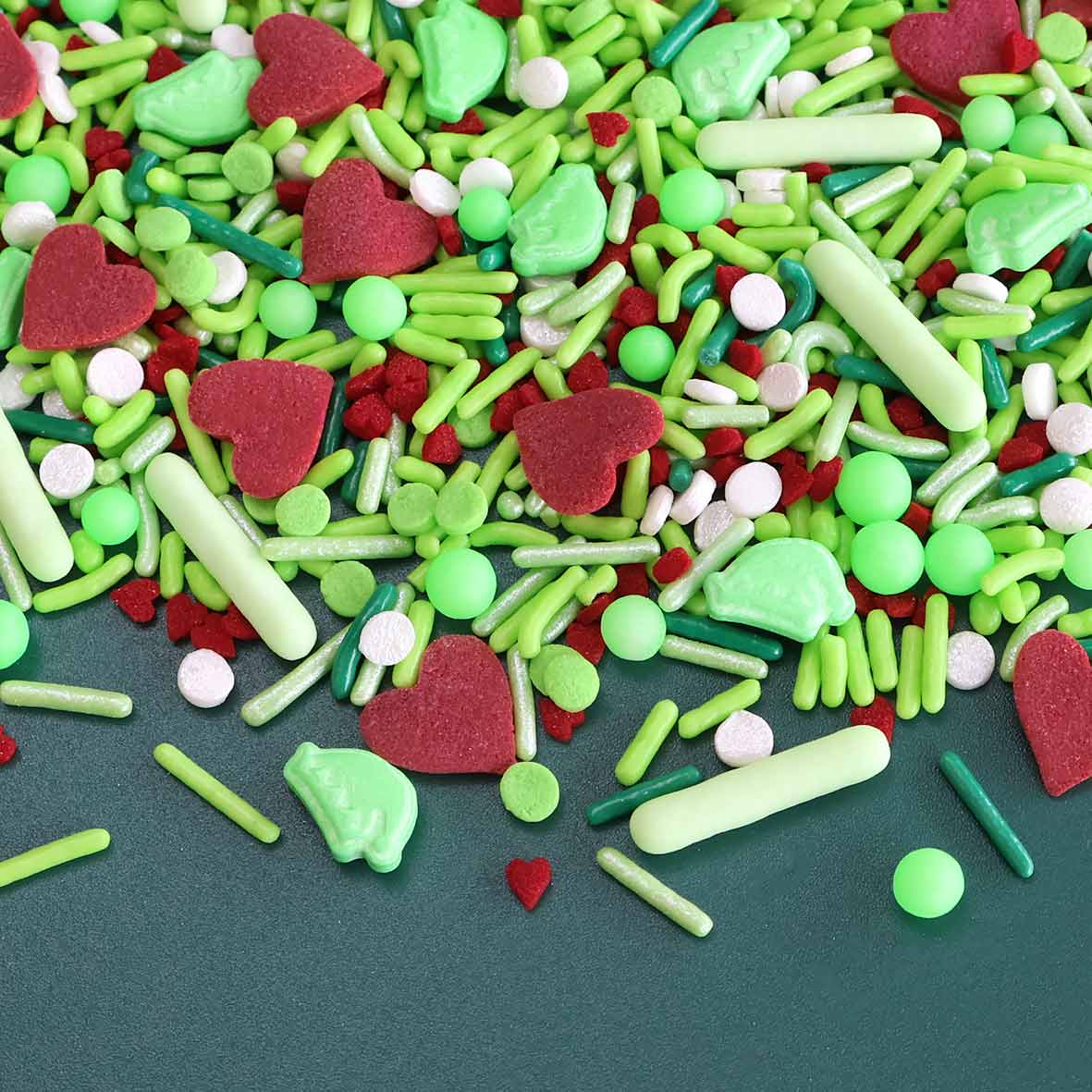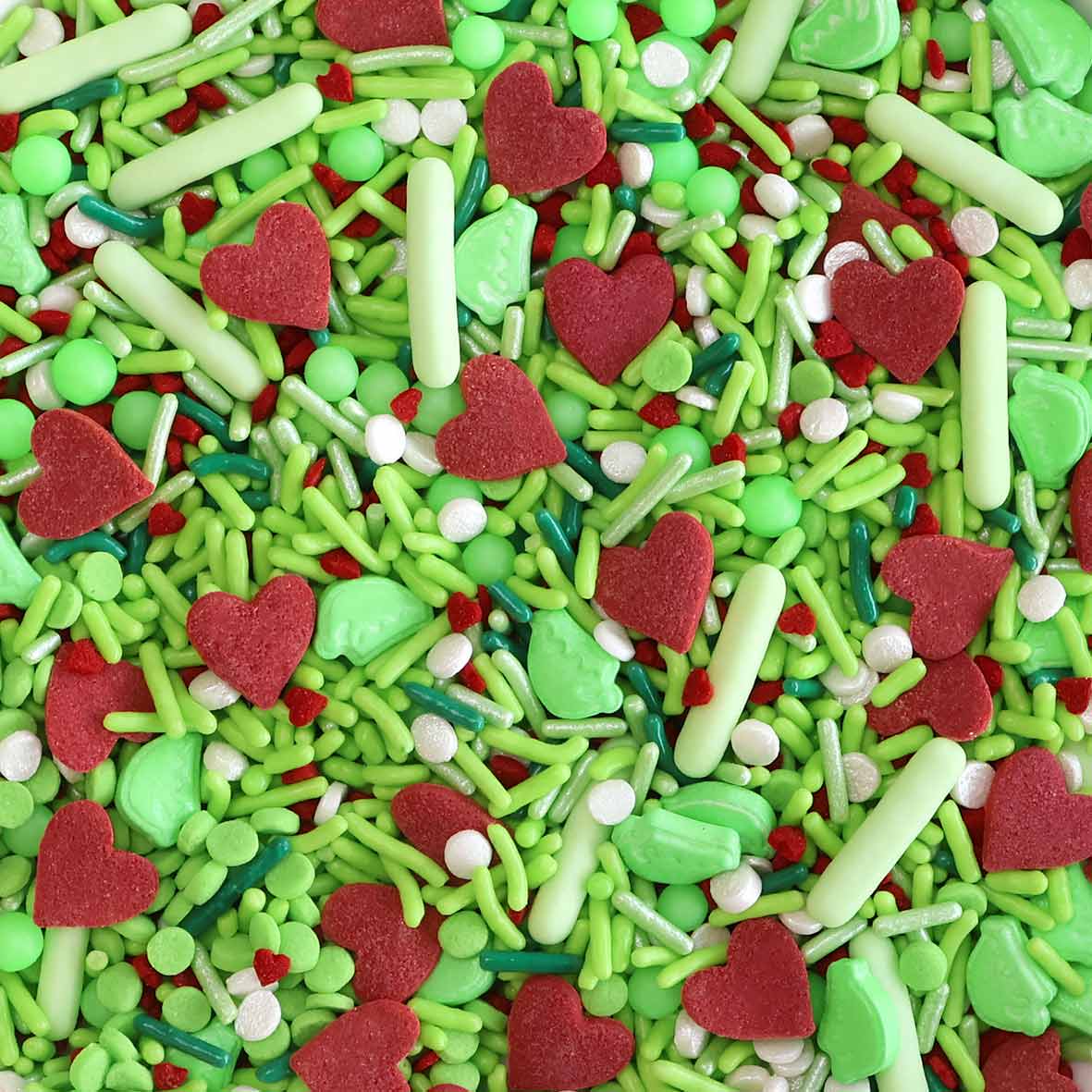 MEAN ONE SPRINKLE MIX is a sweet blend packed with Elf Hat Candy Sprinkles, Large Red Heart Quin Confetti Sprinkles, Neon Green Glow In The Dark Sugar Pearl and other classic sprinkles to glam up your cakes, cupcakes, and cookies! Ideal for Grinch themed holiday parties!❄️🎄