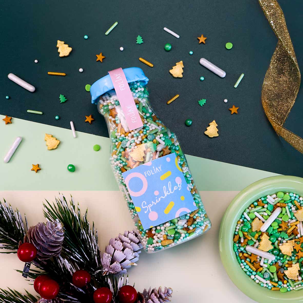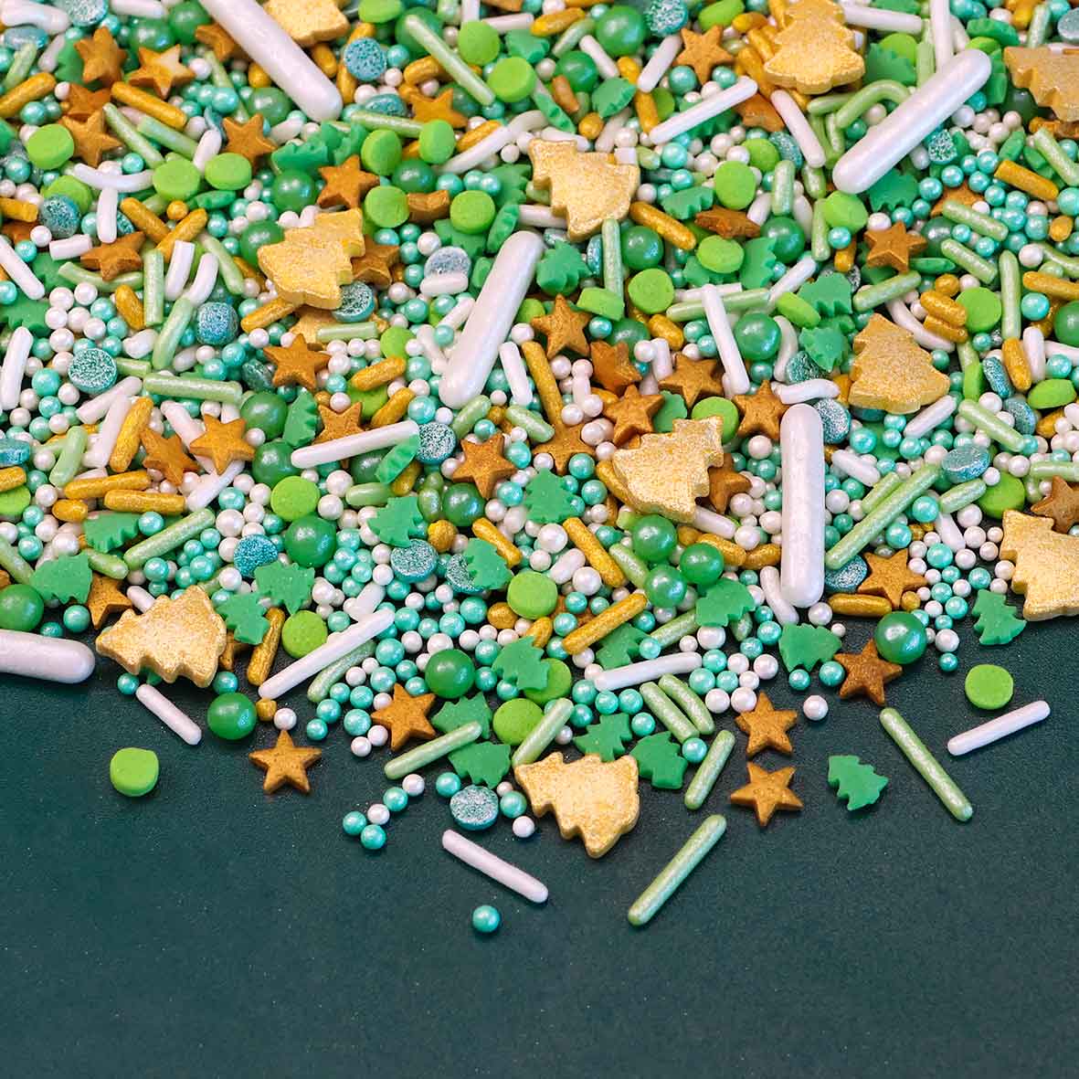 MISTLETOE MAGIC SPRINKLE MIX is a sweet blend packed with Gold Christmas Tree Candy Sprinkles, Green Pearl Quin Sprinkles, White Pearls Jimmies Sprinkles and other classic sprinkles to glam up your cakes, cupcakes, and cookies! Ideal for holiday treats and Christmas celebrations❄️🎄!