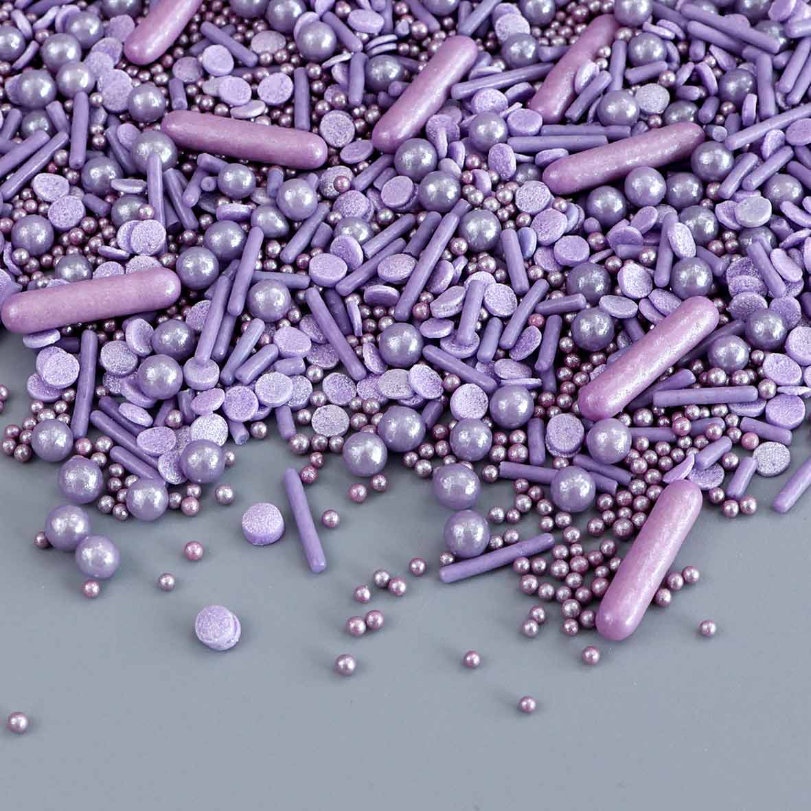 PERFECTLY PURPLE SPRINKLE MIX is a single color blend of Purple Pearlized Rod, Purple Shimmer Nonpareils, Lavender Jimmies Mix, Lavender Sugar Pearls and Purple Pearl Quin Sprinkles to glam up your cakes, cupcakes, and cookies! Perfect for everyday, birthday party🎂 and more!