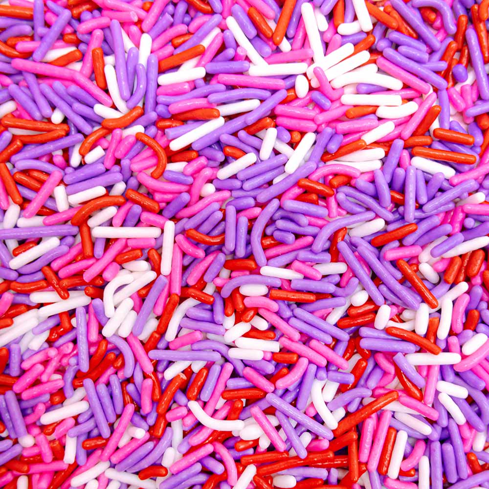 LOVE SPELL JIMMIES MIX is a pretty blend of Red, Purple, Hot Pink and White Jimmies Sprinkles to top up your cake🍰, cupcake🧁, cookie🍪, cakepop🍭, chocolate bark🍫! Perfect for Valentin's Day, Wedding, and Mother's Day Celebration!