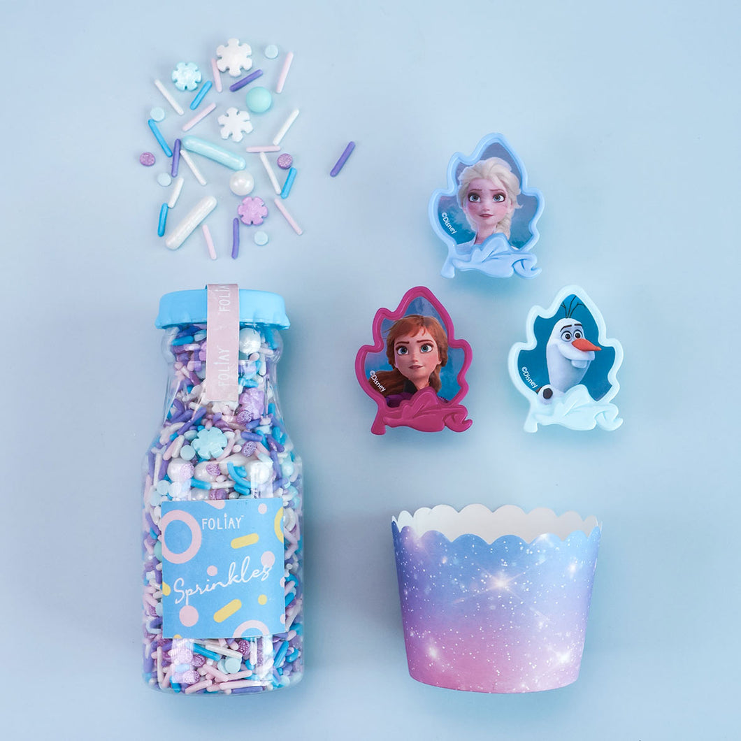 Our FROZEN CUPCAKE DECORATING KIT contains a 4oz bottle of Frozen Fantasy Sprinkle Mix, 12 Frozen Cupcake Rings and comes with 12 Cupcake Liners. Make your own Frozen-Princess themed cupcakes at home with this fun DIY cupcake kit and start getting creative! Perfect for birthday celebrations🥳, baby showers🍼 and Frozen Princess themed parties❄️💙!